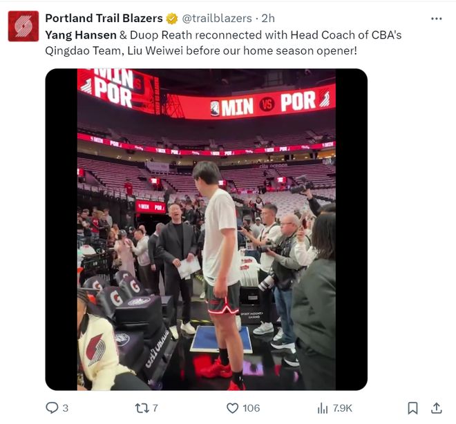 不管是开拓者官方还青岛男篮官方都给足了杨瀚森面子,刘维伟指导来亲自督战,而且开拓者官方连续发推记录杨瀚森这个常规赛主场首秀。