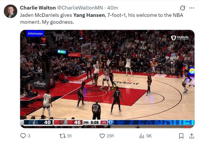 不过第二节很快麦克丹尼尔斯就欢迎了小杨一把,他直接弯弓搭箭隔扣了身高7尺1的杨瀚森(2.16米),杨瀚森被扣的有些蒙圈。