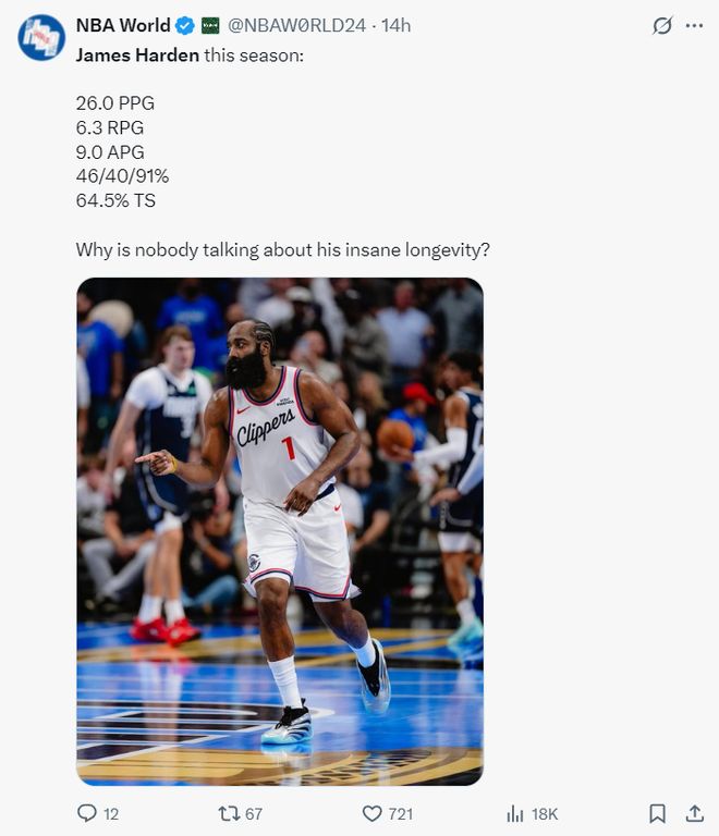 本赛季的哈登场均26分6.3篮板9助攻,命中率46%,三分命中率40%,罚球命中率91%,真实命中率64.65%,美媒:人们不是应该讨论他超长的巅峰期吗?